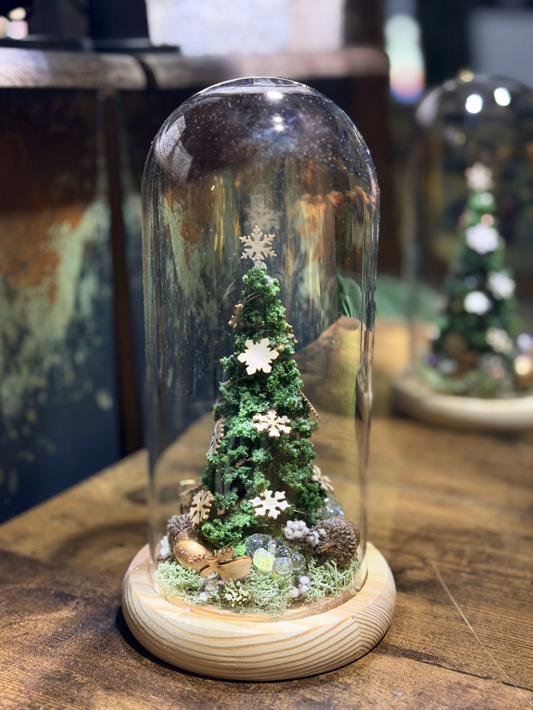 Wewnątrz szklanej kopuły znajduje się drzewko, które zostało subtelnie ozdobione.