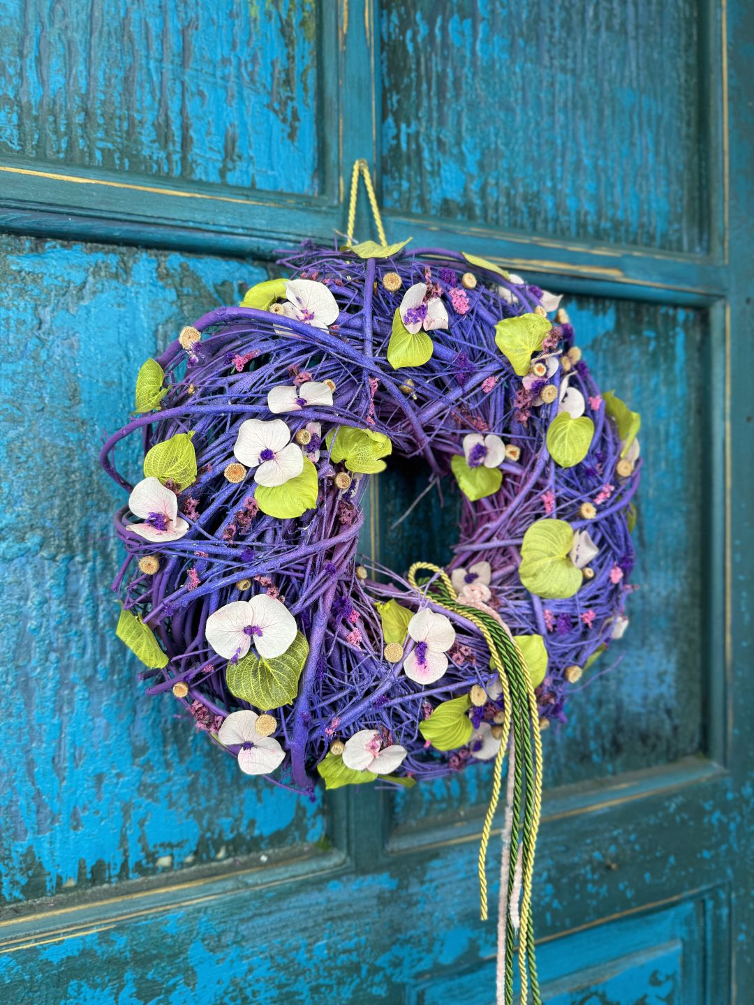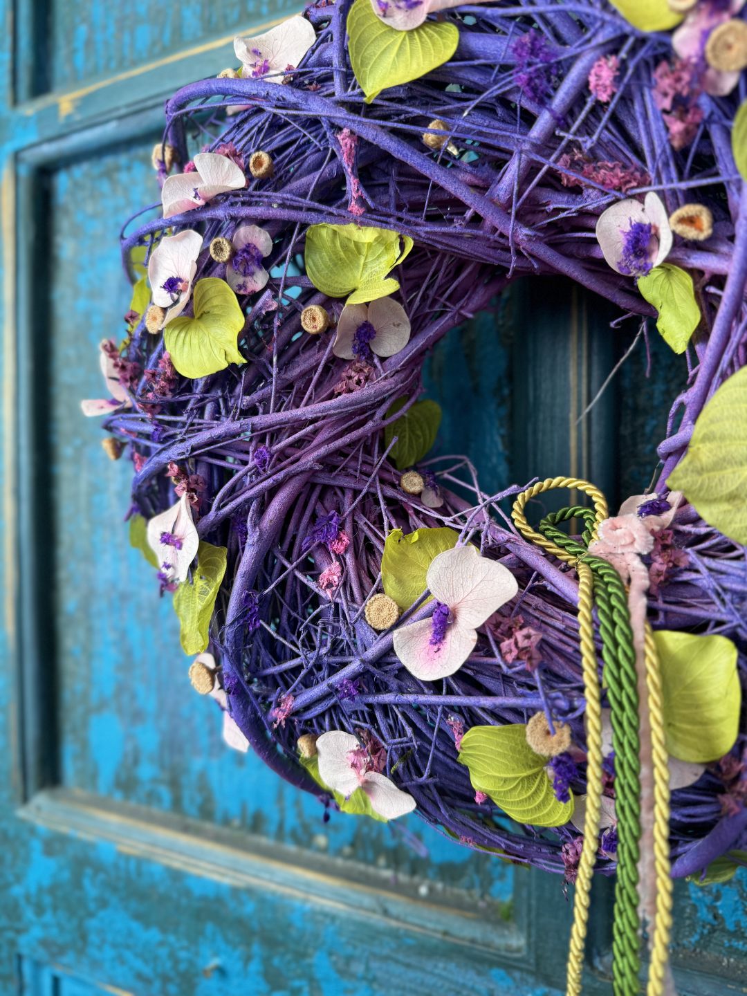 Barwiony, wykonany z naturalnych gałązek wianek na drzwi. Udekorowany został kontrastowymi, stabilizowanymi dodatkami oraz suszonymi kwiatkami.
