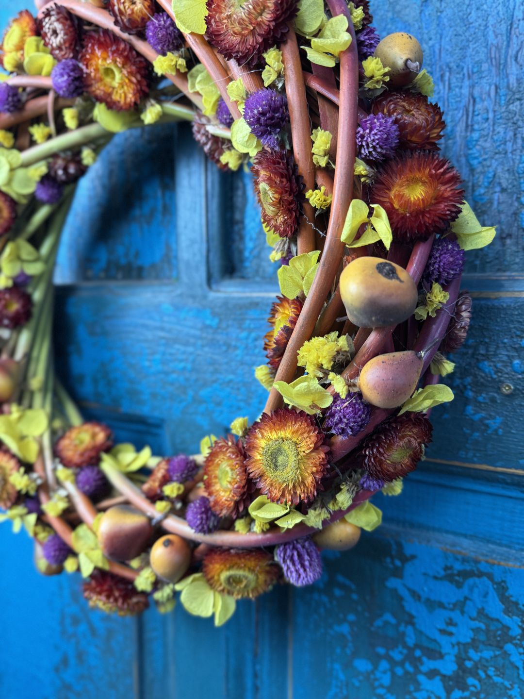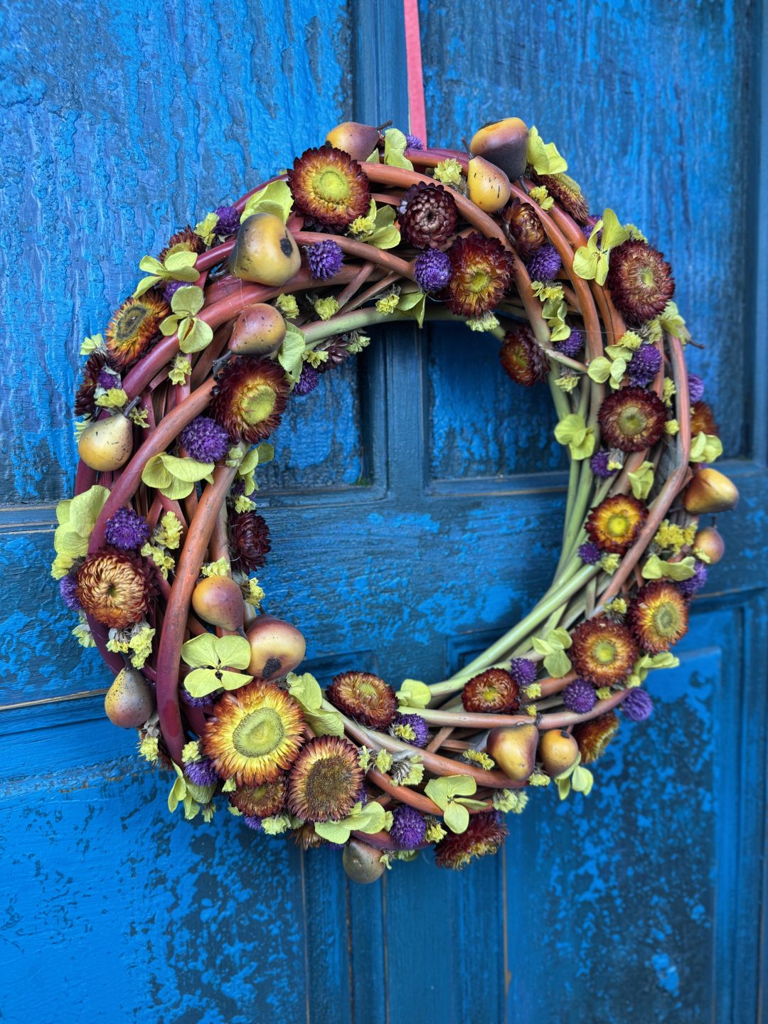 Barwiony, wykonany z naturalnej wikliny wianek na drzwi. Całość kompozycyjną tworzą stabilizowane kwiaty hortensji, suszone kwiaty kocanki, zatrwianu oraz koniczyny. Letniego akcentu dodadzą wiankowi sztuczne, drobne gruszki.