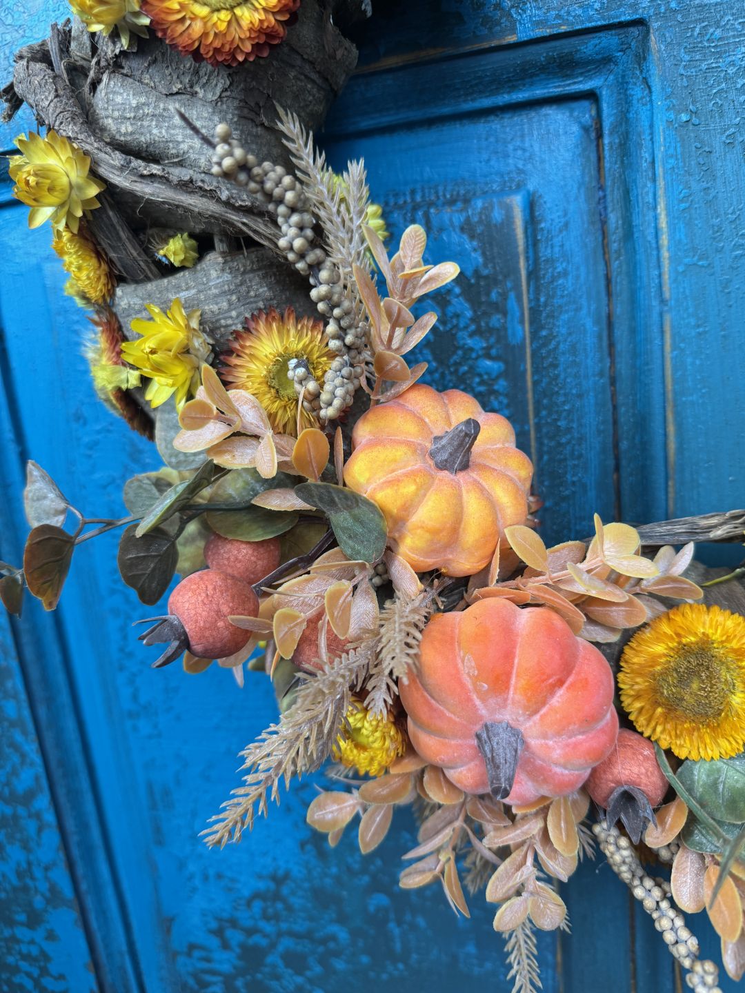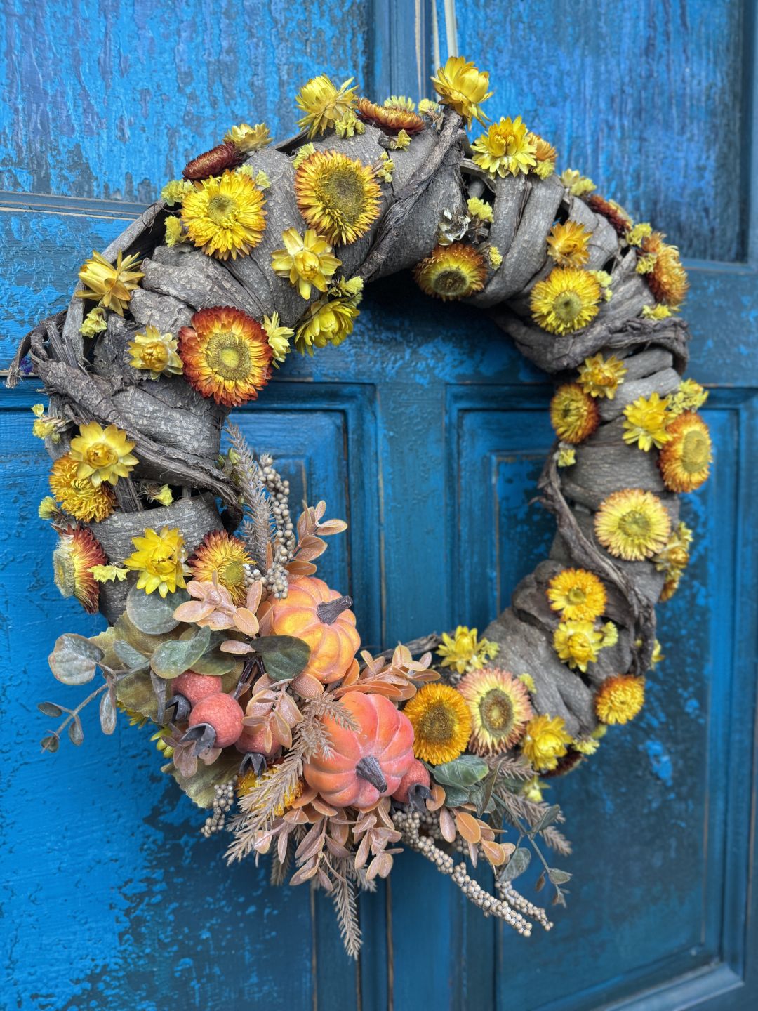 Wianek na drzwi, którego baza wykonana jest z uplastycznionej, suszonej kory. Broszka wykonana jest ze sztucznych dyń oraz dodatków.