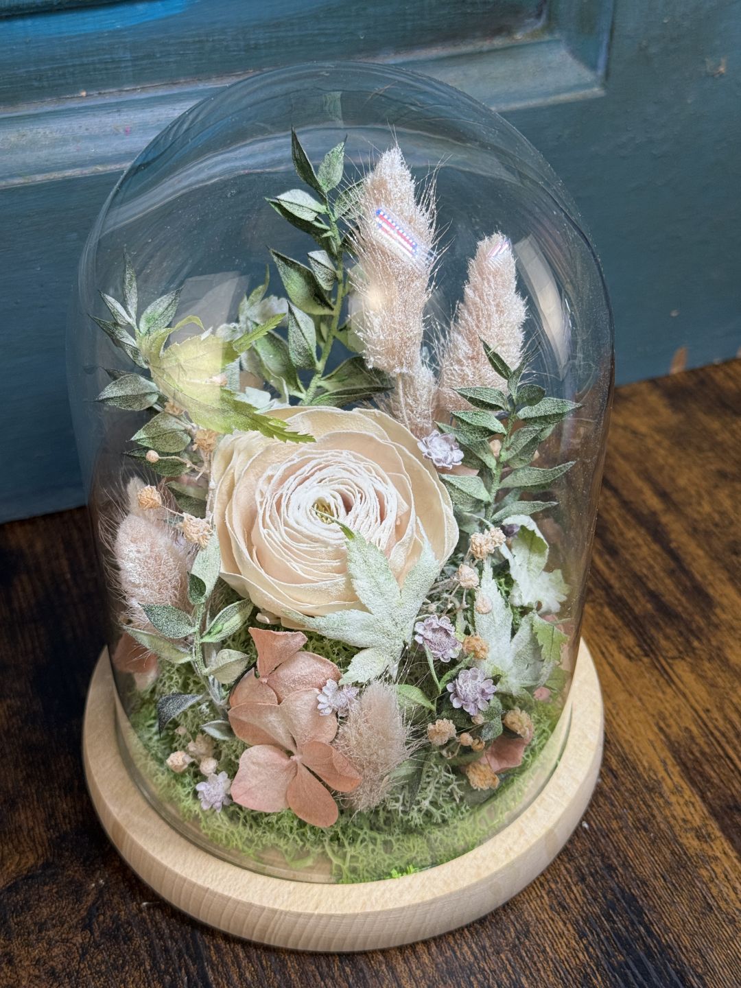 Pod szklanym kloszem stworzona została leśno - bajkowa aranżacja ze stabilizowanych kwiatów, porostów oraz suchych kwiatów.