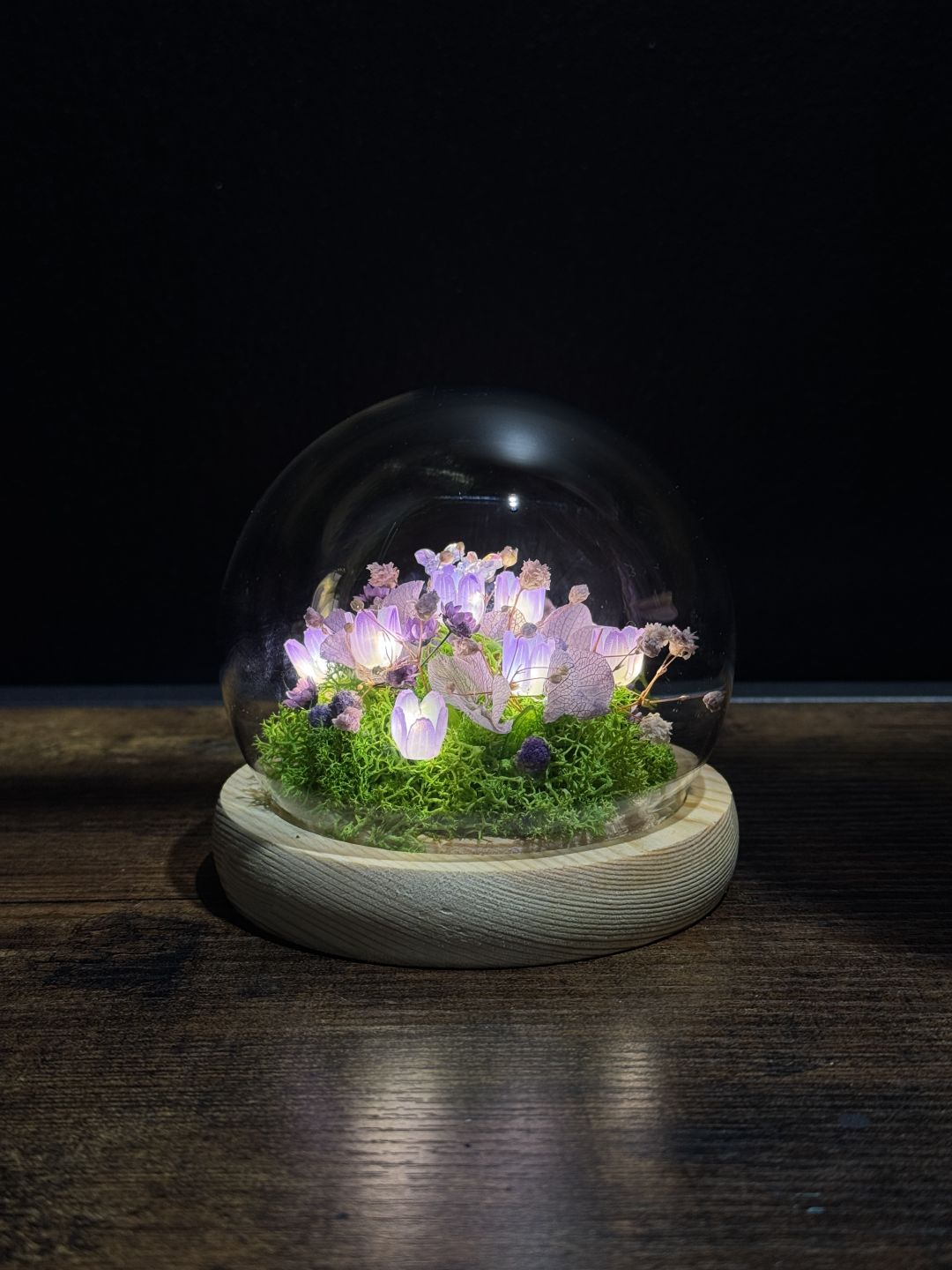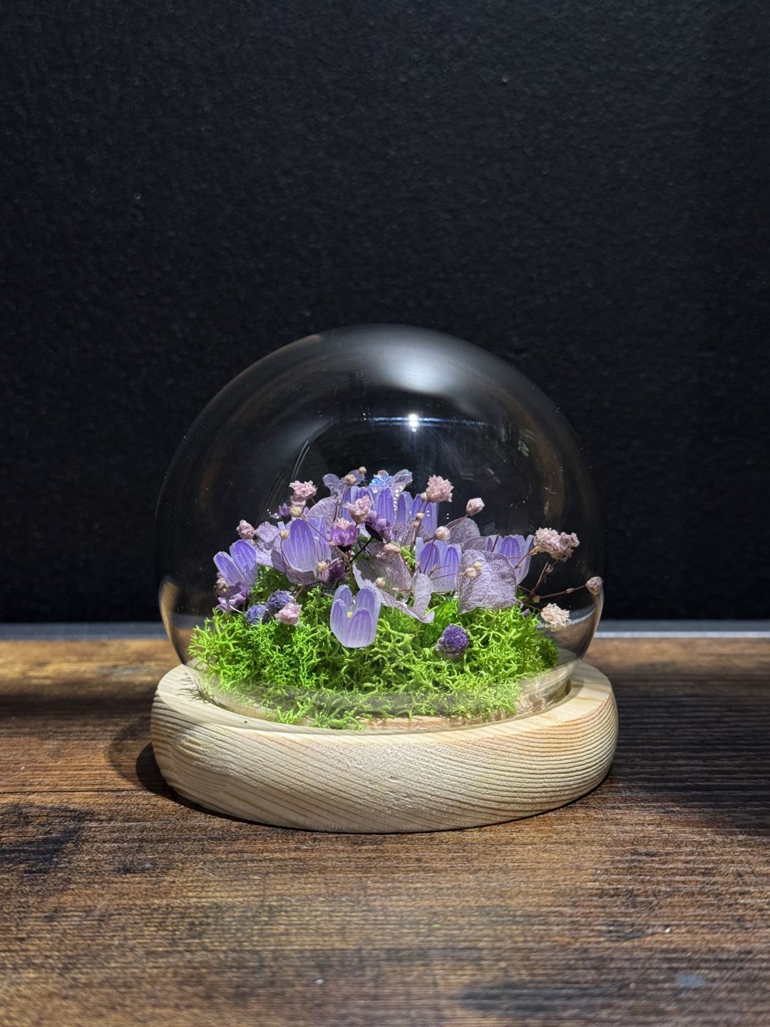 To maleńka kompozycja mieszcząca się w ludzkiej dłoni. Wewnątrz szklanej kuli znajduje się miniaturowy świat wykonany ze stabilizowanych kwiatów oraz dodatków.
